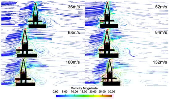 Figure 11 shows the streamlines on a transversal plane. The recirculation patterns observed can also be seen with the streamlines and the vorticity colormap, with red when the recirculation is higher and blue when the flow is linear. It is worth mentioning that due to the reduction of the airflow area, the air reaches the reclaimer with velocities higher than the free current, which might increase the pressure gradient and aerodynamic forces, increasing the probability of failure by stabilization. The results showed more intense vorticity at higher wind speeds, caused by an increase in the displacement of the reclaimer and an increase in the velocity gradients in the boundary layer next to the reclaimer. The format and size of the vortices after the reclaimer were similar for all wind speeds, but distinct magnitudes and thicknesses were observed.