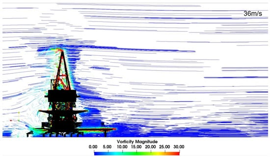 The streamline and vorticity patterns depicted in the CFD results for both the complex and simplified models of the reclaimer structure offer insightful contrasts. In the complex model, which only incorporates CFD and is limited to a single wind speed of 36 m/s, the streamlines exhibit pronounced interaction with the structure, demonstrating intricate patterns of flow separation and recirculation zones (Figure 12).