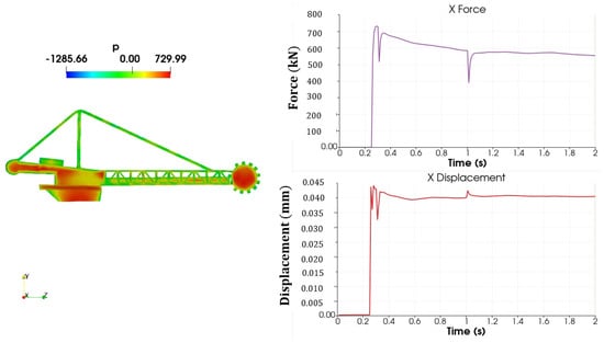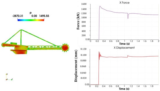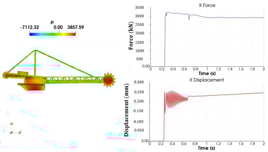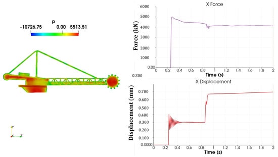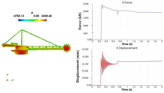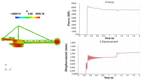 For a wind speed of 132 m/s (Figure 19), the average X force was about 7000 kN, 22% higher than the analytical value. In this case, the maximum displacement value was about 1.4 mm, and the stability failed due to reaction forces, as can be seen in Figure 15.