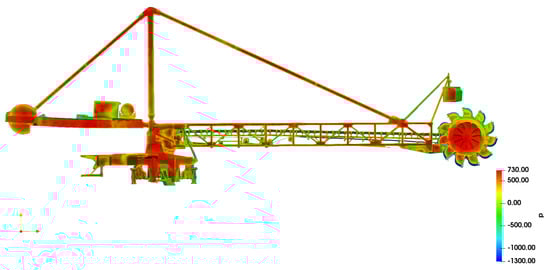 Analyzing the surface pressure results between the two models (Figure 13 and Figure 14) provides a clear visual contrast of the pressure distribution due to the wind load on the reclaimer. The complex model, which seems to incorporate a higher level of geometrical detail, shows pressure extremes with higher fidelity. This can be observed from the more pronounced pressure gradients on certain components of the structure, which can be critical in identifying localized stress concentrations that could impact design and fatigue life assessments. On the other hand, the simplified model, despite its reduced mesh detail, still captures the overall pressure distribution trend. However, it smooths out the localized pressure extremes, possibly overlooking areas that could be susceptible to high stress concentrations. This can be beneficial for computational efficiency and for identifying general load distribution patterns for preliminary design stages or for larger design iterations where detailed local effects are less critical.