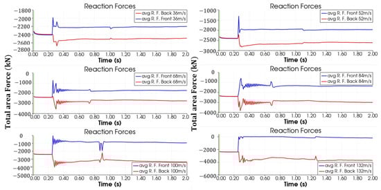 For the lower wind speeds (36, 52, 68, 84, and 100 m/s), an increase can be seen in the difference between the reaction forces on the front and back supports, but these forces stabilize over time. For the wind speed of 132 m/s, the reaction force on the front support reached 0 N and it was concluded that the structure failed by stability.