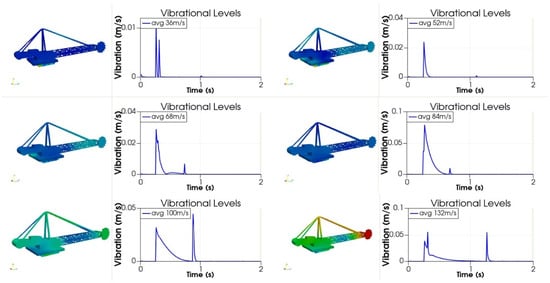 To evaluate the dynamic behavior of the reclaimer, the vibration levels are shown in Figure 21. It can be seen that the higher vibration levels are found in the initial steps when the structure was suddenly subjected to the crosswind. The vibration levels reduced over time, and they could not cause a dynamic displacement amplification high enough to make the structure fail for stability causes.