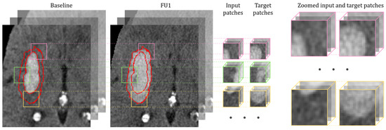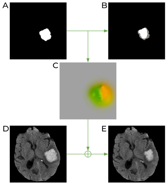 Once this step is complete, we move to the second stage and calculate a transformation to deform the baseline image accordingly. Following the same approach as in [23], we achieve this by deformably registering the original baseline mask to the eroded one by using the publicly available Greedy software [28]. This results in a deformation field from the real baseline to the desired one (see Figure 1C). In the third step, we apply this resulting deformation field to the original baseline CT image to artificially shrink the hemorrhagic stroke lesion (Figure 1E). The intensities in the resulting image are obtained with linear interpolation. Finally, our training set includes 6 baseline–follow-up pairs generated from one patient: the original pair and 5 more pairs where the baseline lesion has a different appearance. Note that the follow-up images are the same for all the pairs within the same patient.
