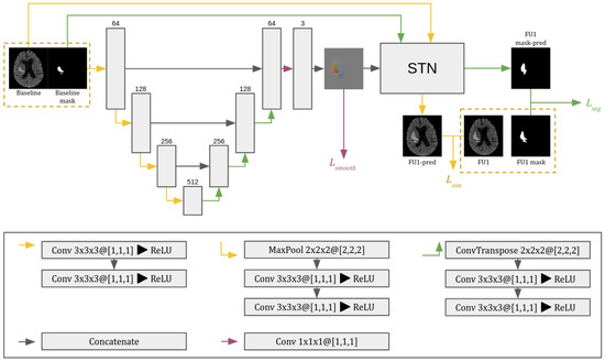 As shown in Figure 3, our proposal is based on a 3D U-Net architecture similar to the one of [14]. Each block in the encoding path contains two 3 × 3 × 3 convolutions followed by ReLU. Down-sampling in each resolution step is performed by a 2 × 2 × 2 max pooling operation with a stride of 2. In the decoder, up-sampling is performed with an up-convolution operation of 2 × 2 × 2 with a stride of 2, followed by two 3 × 3 × 3 convolution operations each followed by ReLU. Skip connections are also introduced at each level of the network and allow the decoder to access the higher-resolution features learned by the encoder. We obtain the DVF with a three-channel 1 × 1 × 1 convolution operation without activation function. Then, the spatial transformer network (STN) applies the learned DVF to warp the baseline CT image and its hematoma mask into the predicted follow-up (FU1) CT image and its predicted hematoma mask. The total number of parameters of the proposed network is 22.4 M. The overall configuration of network training and testing is described in the following section.