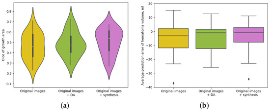 In Figure 4a, we show the violin plots regarding the distribution of the Dice scores of the HE area for the different studied approaches. We can observe that the median Dice score of the growth area for the setting where we added synthetic images in the training phase is better than the ones of models trained only on original images and using traditional data augmentation. The same behavior can be seen for the interquartile range, which lies between higher values for the model exploiting the use of synthetic images. Furthermore, we noticed that for this setting, the distribution of the Dice scores of the HE area is more concentrated within the median value or higher, which also highlights the use of synthetic images. These results, together with the quantitative measures provided in Table 1, confirm that the addition of the synthetic data generated to improve the training process helps the model to learn HE more precisely, improving the predictions in most of the cases. Figure 4b shows the distribution of the prediction error in hematoma volume obtained with the proposed models. Again, we can see that both traditional data augmentation and image synthesis approaches reduce the error in the predicted volume, moving the median of the errors towards zero. Moreover, the distribution of the AEV obtained with the model trained using synthetic images has smaller interquartile ranges than the other two models, producing more robust and consistent results.