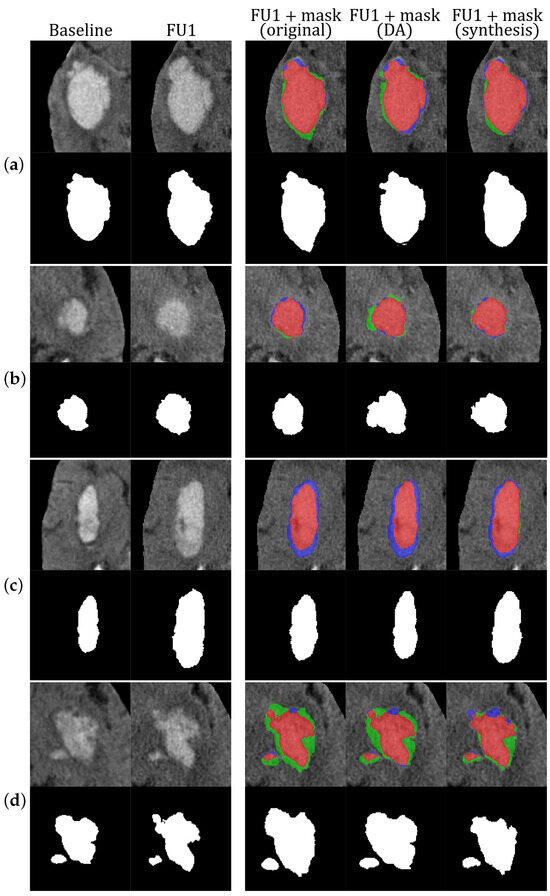 Examples of the resulting masks obtained in our experiments. For each case (a–d), the top row shows (from left to right): baseline CT image, follow-up CT image, follow-up CT image overlayed with the resulting mask from the experiment performed only with original images, follow-up CT image overlayed with the resulting mask from the experiment performed with original images and traditional data augmentation, and follow-up CT image overlayed with the resulting mask from the experiment performed with original and synthetic images. The colors of the overlayed masks represent true-positive voxels (red), false-positive voxels (green), and false-negative voxels (blue). The bottom row for each case (a–d) shows the corresponding hematoma masks. DA stands for traditional data augmentation.