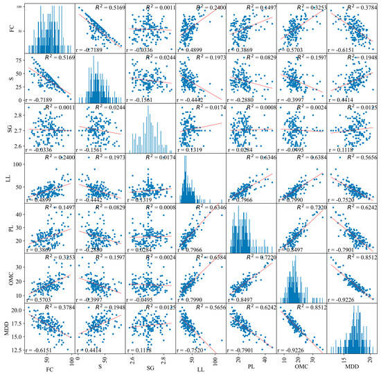 Detail of Pearson’s correlation coefficient/matrix of soil database. FC fine content; S sand content; SG specific gravity; LL liquid limit; PL plastic limit; OMC optimum moisture content; MDD maximum dry density; r Pearson correlation coefficient; R2 coefficient of determination.