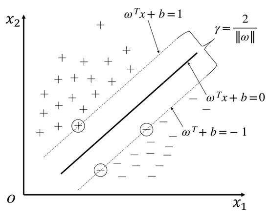 SVM is a classic model for the binary classification of data, which is based on the principle of distinguishing data into two classes in an optimal way through hyperplanes [30]. SVM has good performance and advantages for small- and medium-sized data samples, nonlinear, and high-dimensional problems and can be used to handle regression and classification tasks [31]. As shown in Figure 2, the SVM hyperplane equation expression is