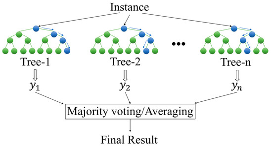 RF belongs to the bagging algorithm in ensemble learning, and its basic unit is the decision tree. As shown in Figure 4, RF utilizes multiple decision trees for prediction or classification, and the final result is the average or voting result of all decision trees. In constructing each decision tree, RF employs two randomization methods: bagging and random feature selection. Random feature selection is to randomly select a subset of features in the feature set for tree node partitioning, which can reduce the correlation between decision trees and further improve the performance of the model [35].