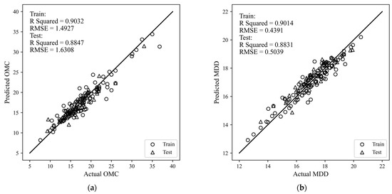 Regression plots between actual and predicted values with RF; (a) OMC; (b) MDD.