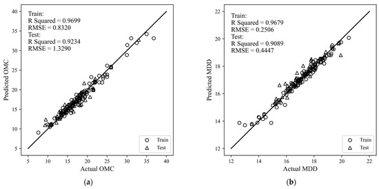 As shown in Table 5 and Figure 10, in the best prediction model, RMSE = 1.3290% and R2 = 0.9234 for OMC, and RMSE = 0.4447 kN/m3 and R2 = 0.9089 for MDD. The results show that XGBoost has a good performance in predicting both OMC and MDD, and its R2 can reach above 0.90.