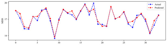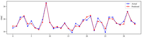 Figure 14 and Figure 15 show the actual and predicted values of OMC and MDD for the test set in XGBoost, respectively. From the figures, it can be seen that the overlap between the real and predicted values is very high when the model has excellent performance. Even though some of the data are poorly predicted, the error with the true values is around 4%, which is an acceptable range. This shows that machine learning algorithms can be applied to predict OMC and MDD with great efficiency and advantage.