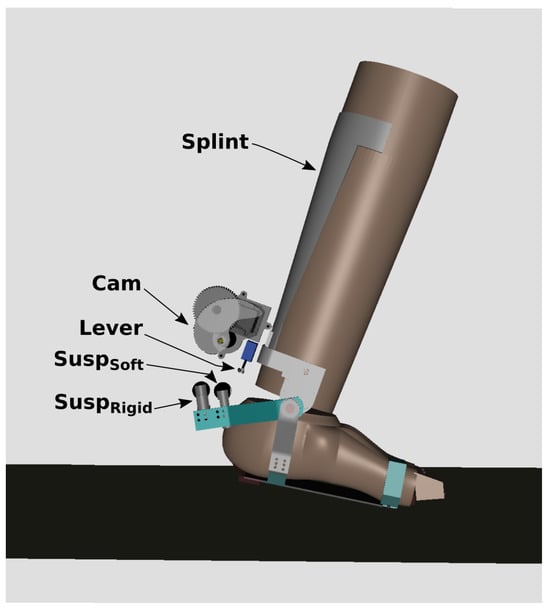 Suspensions: A suspension system was designed for acting at different assistance stages, with two elements named and . The element, composed of a spring and a shock absorber, will transfer movement from the cam to the ankle joint. It is rigid enough to preserve the position and to work as a compliant component for possible external disturbances, helping to protect the main servomotor. The element , with just a spring component, has a low stiffness value and will contact the lever to reduce slapping.