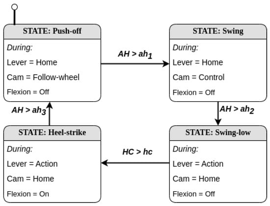 We used a finite state machine (FSM), depicted in Figure 2, to control the AAFO during the different stages of the gait cycle. It consists of four states: Push-off, Swing, Swing-low, and Heel-strike. The simulation starts in the state Push-off of the FSM, just before starting the toe-off of the foot. Figure 3 depicts the stages of the FSM described during a gait cycle with the ankle angle reference signal. For a clearer FSM description, in the following lines, the inputs and outputs are explained, followed by the possible actions of the cam.