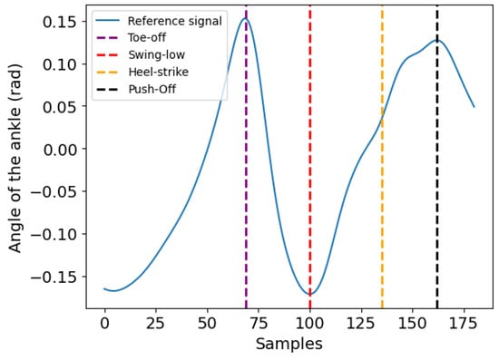 Ankle angle reference signal, with vertical lines indicating the starting points of every stage of the FSM. Toe-off is the start of the stage Swing, and other initial points have the name of its respective stage. The sampling rate is 0.01 s.