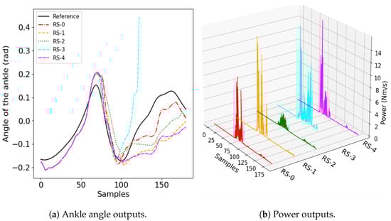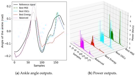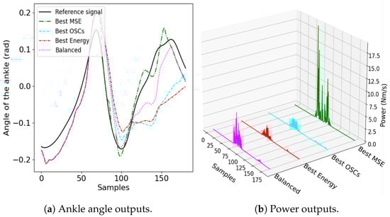 Figure 9 shows the response in the angle graph (left side) and power graph (right side), for one of the initial conditions (10 degrees of ankle dorsiflexion), of the solutions in Table 2 for SS-NSGA-II. Figure 10 shows the same information but for SS-RVEA. On the ankle angle response graph of both figures, the reference signal was added for clarity.