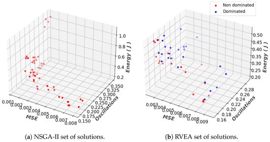 After 300 generations, SS-RVEA resulted in 19 non-dominated solutions and 25 dominated, while SS-NSGA-II resulted in all the solutions being non-dominated. We could resume the comparison of mean and standard deviation among SS-NSGA-II and SS-RVEA as follows: for the MSE objective, values from SS-NSGA-II resulted better than the ones from SS-RVEA, but for the oscillations and energy objectives, SS-RVEA values resulted better than SS-NSGA-II values, with a more notable difference in the third objective, where the mean from SS-RVEA is less than the mean from SS-NSGA-II.