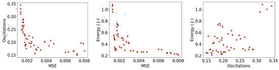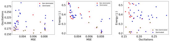 Planar views of the NSGA-II set of solutions, projecting them onto different combinations of two cost components. From left to right: MSE vs. Oscillations, MSE vs. Energy, and Oscillations vs. Energy.