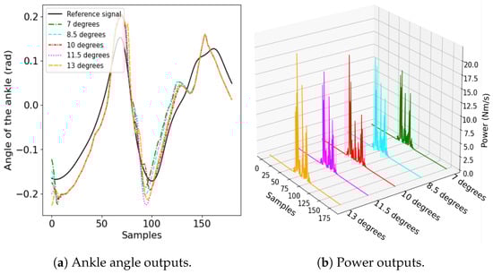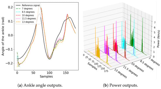 In order to appreciate the robustness of the solutions to the initial ankle angle, Figure 11 shows the ankle angle signal and the power signal resulting from simulating the best individual, chosen by MSE objective from the SS-NSGA-II, at the different initial conditions (from 7 to 13 degrees). Figure 12 shows the same cases for SS-RVEA.