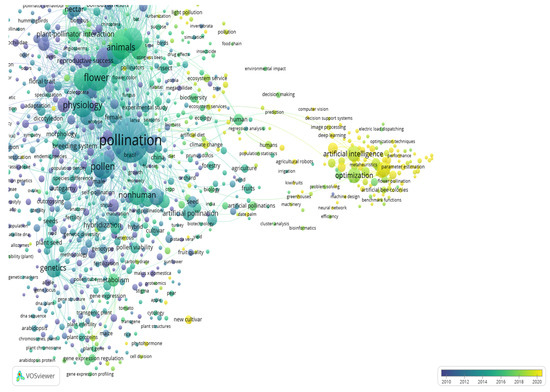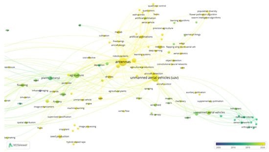 Even more, using VOS viewer mapping software and the Scopus bibliographic database based on the search strategy criteria “Aerial and Pollination” (Figure 6) revealed that all of the abovementioned criteria or technologies show promise, but they still require important improvements, such as “antennas”, “aircraft detection”, “aircraft control”, “MATLAB”, “internet of things”, “population diversity”, “flower population algorithm”, “swarm intelligence algorithm”, “learning algorithm”, “learning systems”, “deep learning”, “quadrotor control”, “image enhancement”, “auxiliary pollination”, “supplementary pollination”, and “convolutional neural networks” (Figure 6, items with yellow dots).
