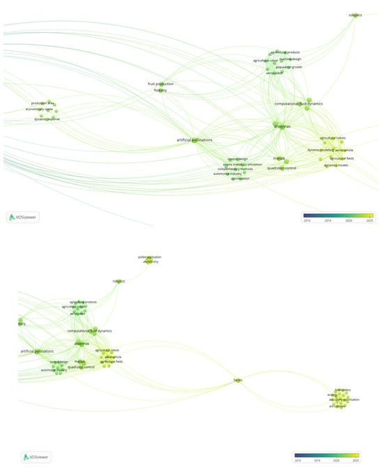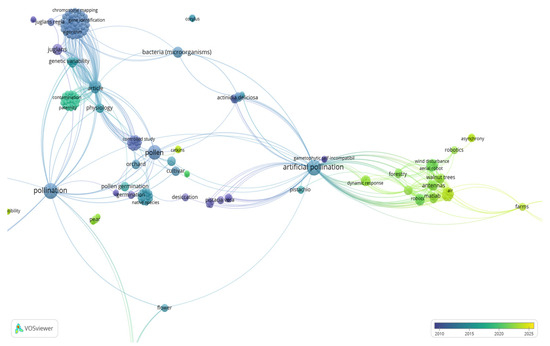 Furthermore, it is important to note that while artificial pollination can be a useful tool in certain situations, such as for walnut trees, apart from robotics (co-keyword: “artificial robots”, Figure 2), modeling (co-keyword: “MATLAB”, Figure 2), and agriculture drones (co-keyword: “agriculture drones”, Figure 2), pollen germination (co-keyword: “pollen germination”, Figure 2) and knowledge of pollen as a possible pathway for the dissemination of bacterial diseases of other crops, such as pear and kiwifruit plants (co-keywords: “pear” and “Actinidia deliciosa”, Figure 2), remain crucial information for the design and manufacture of aerial pollinator robots for walnut trees.