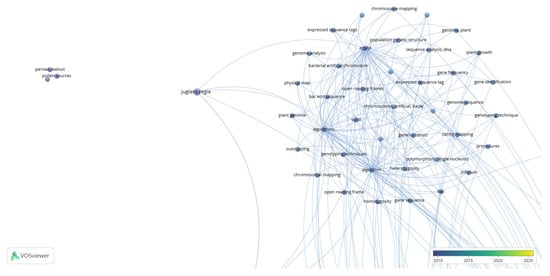 Cluster 2 (Figure 4) is defined by 45 keywords (items), with keywords including “algorithms”, “bacterial artificial chromosome”, “chromosomes, artificial, bacterial”, “contig mapping”, “expressed sequence tags”, “genome analysis”, “genotyping techniques”, “heterozygosity”, “homozygosity”, “physical map”, “plant genome”, “plant growth”, “pollen sources”, “population genetic structure”, “sequence analysis, DNA”, “single nucleotide polymorphism”, “vegetative propagation”, etc.