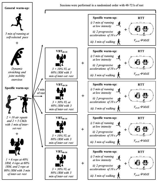 Overview of the experimental design. MAS, maximal aerobic speed; CMJ, countermovement jump; 1RM, one-repetition maximum; RTT, running track test; Vpeak, peak velocity; VBT60–10, velocity-based training (VBT) with 60% of 1RM and a velocity loss (VL) in the set of 10%; VBT60–30, VBT with 60% of 1RM and a VL in the set of 30%; VBT80–10, VBT with 80% of 1RM and a VL in the set of 10%; VBT80–30, VBT with 80% of 1RM and a VL in the set of 30%.