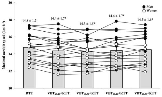 Comparison of the maximal aerobic speed between protocols. Data are depicted as means and standard deviation, whereas each point represents the individual data of each man (black circles) and woman (white circles). RTT, running track test; VBT60–10 + RTT, velocity-based training (VBT) with 60% of one-repetition maximum (1RM) and a velocity loss in the set of 10% followed by RTT; VBT60–30 + RTT, VBT with 60% of 1RM and a velocity loss in the set of 30% followed by RTT; VBT80–10 + RTT, VBT with 80% of 1RM and a velocity loss in the set of 10% followed by RTT; VBT80–30 + RTT VBT with 80% of 1RM and a velocity loss in the set of 30% followed by RTT. *, significantly lower than RTT (p < 0.05; analysis of variance with Bonferroni correction).