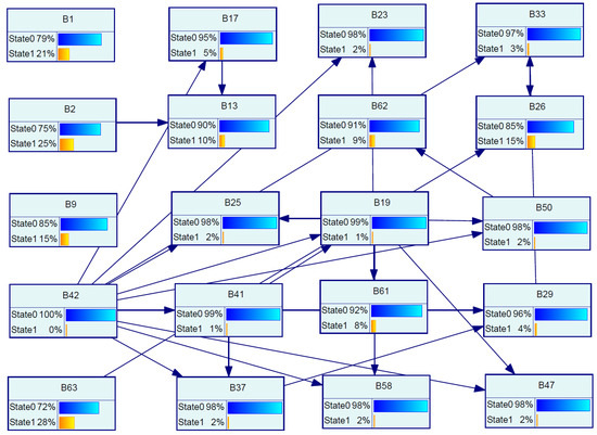The data samples used in this study were sourced from real accident reports, but due to various different factors, the information contained in the accident reports was not necessarily uniform, and some information might have been missing. Therefore, the EM algorithm was employed to compensate for a small number of missing fault reports, improve the convergence speed for the small sample size, and reflect the probability values between nodes accurately. By using the parameter learning algorithm provided by the GeNIe 4.0 Academic software, each network node was matched with the corresponding column in the fault data matrix; the values of zero and one in the data matrix corresponded to States 0 and 1 of a node, respectively. State 0 indicated that the risk cause did not exist, and State 1 indicated that the risk cause existed. By setting the EM algorithm and selecting randomized initial parameters as the E-step starting parameters of the EM algorithm, the conditional probability table of the Bayesian network was obtained. The EM algorithm was selected because it has good applicability to data that might contain hidden variables. For example, when learning this type of data, using randomized parameters can effectively avoid the problem of local maximum values compared to using uniformly distributed parameters. The final generated probability map of risks’ key causal conditions in railway engineering safety is shown in