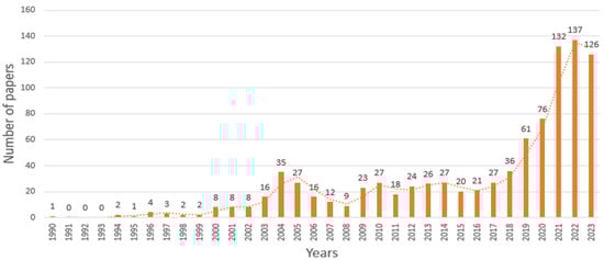 Figure 2 shows the numbers of articles from 1990 to 2023 in chronological order; their total number is 938. Therefore, this time distribution allows us to answer the question RQ-1 (“What are the results of an analysis of electronic voting, cryptographic protocols, and blockchain technology research history?”). Preliminary findings indicate that research in the field of electronic voting began in 1990 and has increased markedly since 2003. This indicates the growing interest of scientists in this field of research over the past few years.