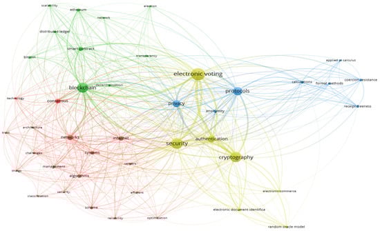 Figure 3 shows that these key terms were divided into four groups, each represented by a distinct color in the visualization. VOSviewer performs clustering based on minimizing the distances between keywords, which means that more closely related keywords are combined into one group. Therefore, the five most closely related keywords in each of these six groups are as follows: (1) algorithms, management, and consensus; (2) blockchain, decentralization, and smart contract; (3) protocol and anonymity; (3) cryptography and authentication; and (4) electronic voting, privacy, cloud computing, computer networks, and zero knowledge. It can be concluded that the first group reflects algorithms, the second group is blockchain and smart contracts, and the third group is cryptography and authentication; that is, user authentication is aimed at confirming the truth of the presented identity to make sure that this person is who he claims to be. The color scheme utilized in the visualization aids in distinguishing between these thematic clusters, providing a visual representation of the relationships between keywords within each group.