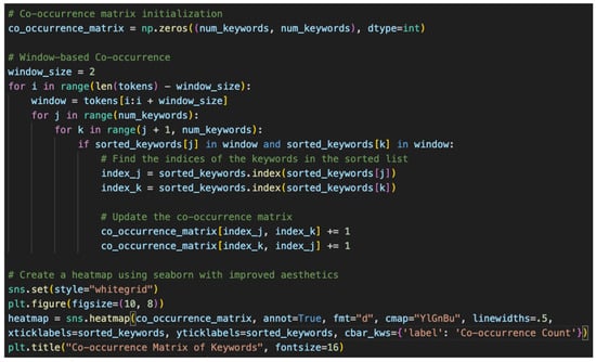 To highlight the most common keywords, Python programming language code was implemented. The program code was then visualized using the matplotlib library version 3.7.1. It is a library for creating static, animated, and interactive graphs in the Python programming language. It is widely used for data visualization and scientific results. Matplotlib provides many functions for creating various types of graphs, charts, and maps. The corresponding fragment of the program code is shown in Figure 5.