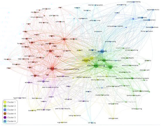 Figure 6 shows that the key terms were distributed across six clusters. The cluster size indicates the frequency of use of a word or term in the text or its importance in the context of analysis. The cluster color can also represent additional information, such as clustering or node categorization, and also indicates different clusters or categories of terms. The closest and most common words in each cluster are (cluster 1) security, privacy, and servers; (cluster 2) electronic voting, cryptography, and authentication; (cluster 3) elections, protocols, and calculations; (cluster 4) blockchain, networks, and consensus; (cluster 5) network, smart contracts, anonymity, and optimization; (cluster 6) security analysis, malware, and biometrics. The conclusions indicate that clusters 1, 2, 3, 5, and 6 represent various applications of electronic voting based on cryptographic protocols and blockchain technology.