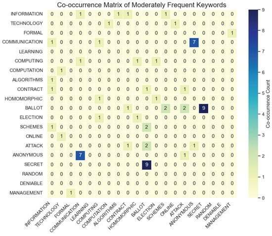 Figure 7 shows a fragment of the coincidence matrix of moderately common keywords in the field of electronic voting based on cryptographic protocols and blockchain technology. Rows and columns represent keywords or terms, and cell values indicate how often these keywords occur together in the analyzed texts. Below are the keywords or terms that occur in the analyzed texts with an average frequency. This helps us to understand which terms are related to each other and which concepts are closely interrelated.