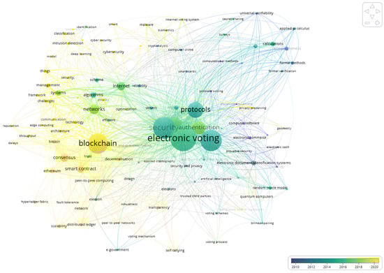 A map of keywords with moderate frequency is shown in Figure 6. To create it, we limited the number of occurrences of keywords in the range from 5 to 11 (which is 80% of all detected keywords according to the Pareto distribution). VOSviewer has identified 140 keywords corresponding to the specified threshold value. The 10 most common keywords are electronic voting (433), security (318), cryptography (314), blockchain (281), protocol (193), privacy (149), authentication (139), networks (85), consensus (67), internet (65), and smart contract (58).