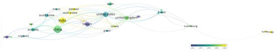 In Figure 10, countries are highlighted according to the APY. The size and color of the nodes may indicate various characteristics, such as the number of publications, citations, or the importance of each country in a given context. New countries that have contributed to this area of research are marked in yellow. These include Pakistan (2020), China (2018), the USA (2016), South Korea (2014), and Taiwan (2012). Compared to WoS, in Scopus, two countries are the same (Pakistan, China) and two differ (Australia and USA). Countries with a high volume of documents, such as China, Spain, Italy, and the UK, have an APY distributed in the middle of the year.