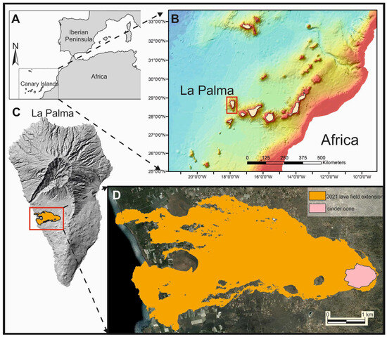 Geographical and geological setting: (A) geographic location of the Canary Islands archipelago; (B) location of La Palma island within the Canary Islands archipelago; (C) digital elevation model (DEM) of the island of La Palma and the location of the area covered by lava flows from the 2021 Tajogaite volcanic eruption; (D) detailed view of the extent of the lava flows and cinder cone of the 2021 Tajogaite eruption.