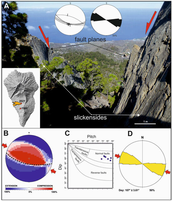 In September 2021, earthquakes of M > 3 at a depth of 9 km began to be recorded. Some of these hypocenters showed a NW-SE alignment at a depth of 9 km. This line was probably contained in a fault plane to which the rest of the hypocenters adapted. This plane could be parallel to the one inferred for the Jedey eruption (1585), since our surface microfracturing data measured at this volcano (Figure 5) show a fault plane with a 100°/80° SW orientation and dip that controlled this eruption and the emission of volcanic material [2]. This fault plane could be compatible with a normal fault with a NW-SE direction of mean horizontal shortening (Dey), coinciding with the regional results of [16] and with the Atlantic Deformation Field. Another fault plane with very similar characteristics can be found in the Roques de Jedey with decametric-sized slickenside, also associated with the 1585 eruption (Figure 5A). Such NW-SE direction faults are part of the Tazacorte Fault (TZF) (Figure 6A). In this case, the cut of this plane with the surface would correspond to an area under extension further north, where the 2021 Tajogaite eruption took place (3D online earthquake viewer of the IGME-CSIC: https://info.igme.es/eventos/Erupcion-volcanica-la-palma/sismicidad3d; accessed on 15 January 2024).