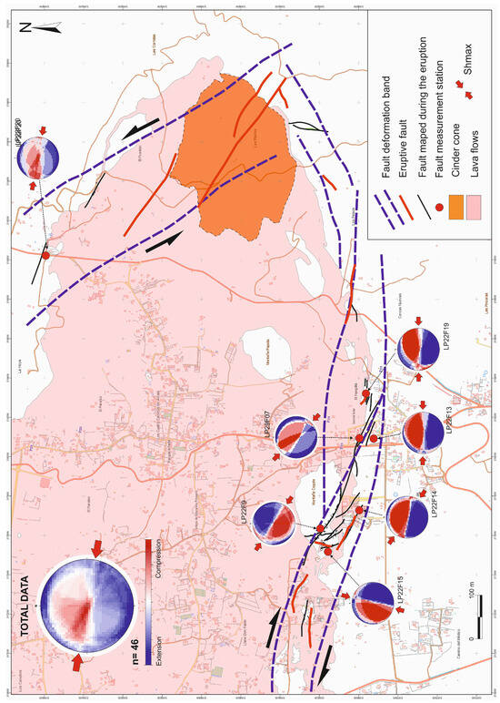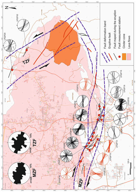 Fault mapping of TZF and MZF and spatial distribution of Right-Dihedron Method solution (pair of data fault plane/slickenside) stations for measuring surface fractures of endogenous origin generated during the eruption.