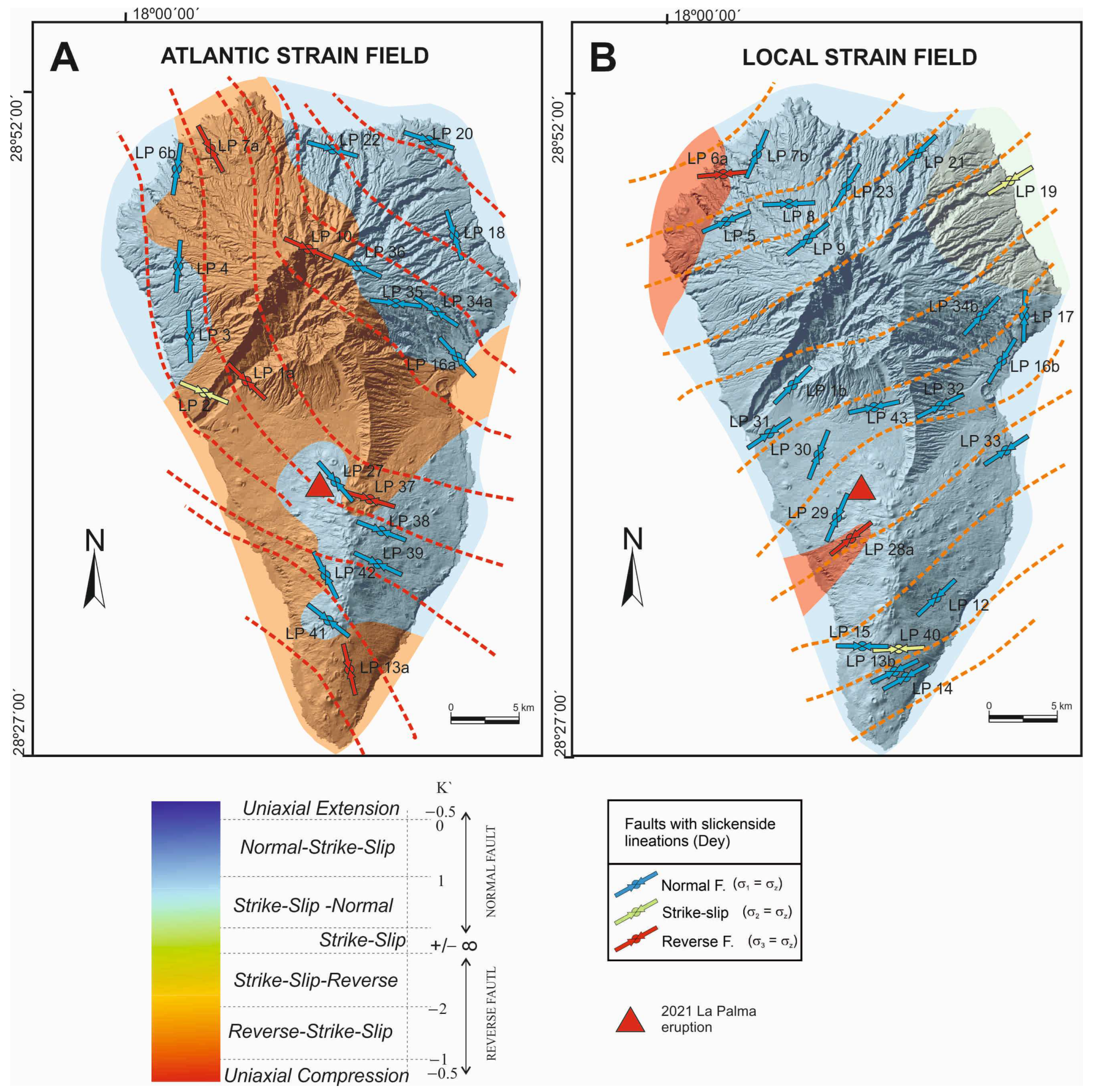 - Rodríguez-Pascua, M.A.; Sánchez, N.; Perucha, M.A.; Galindo, I.; Pérez López, R.; Romero, C. Caracterización espacial de la deformación frágil de en la isla de La Palma (Islas Canarias, España). In Avances en el Estudio de Fallas Activas, Terremotos y Peligrosidad Sísmica de Iberia (Tercera Reunión Ibérica Sobre Fallas Activas y Paleosismología); Canora, C., Martín, F., Masana, E., Pérez, R., Ortuño, M., Eds.; Universidad de Zaragoza: Zaragoza, Spain, 2018; pp. 95–98. [Google Scholar]