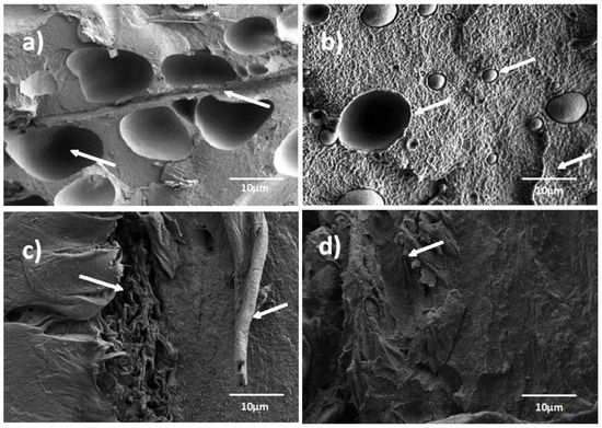 Figure 1a–d represent the SEM microstructure of fractured surfaces of PP/PE blend composites containing SCB, SW, and their extracted celluloses. In general, the images show fiber pull-outs and vacant spaces left by the PE phase. Figure 1a (see arrows) contains more vacant spaces than the rest, arguably followed by Figure 1b (see arrows). The phase separation seems suppressed in Figure 1c,d. Loose and hanging fibers are visible in Figure 1c (see arrows), while clear and large pull-outs are seen in Figure 1d (see arrows). Similar observations were reported in other studies that investigated the fracture surfaces of PP/PE/wood-based composites without a compatibilizer [14,15]. The observations were related to poor adhesion between the fiber particles and the matrix blend, which could be the case in the current study. However, the absence of surface separation in this study case of Figure 1c,d may suggest a stronger interaction compared to Figure 1a,b.