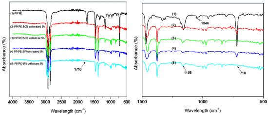 The FTIR spectra of PP/PE, PP/PE/SCB, and PP/PE/SW blend composites are shown in Figure 2. The spectra of PP/PE and all blend composites show main absorbance peaks at around 2915 cm−1, 1716 cm−1, and 1469 cm−1. These peaks are associated with the –CH asymmetric, –CH3 symmetric, and the scissor modes of the –CH stretching of both PP and PE, respectively. Moreover, there are other small peaks at around 1158 cm−1 and 718 cm−1, which are associated with –CH3 symmetric deformation and –CH2 rocking vibration [15,22]. The peak attributed to the hydroxy (–OH) group from fiber materials, as well as intramolecular and intermolecular hydrogen bonds at 3340 cm−1, is more pronounced in the blend containing cellulose [26,27]. This may be due to the stretching and wagging of the groups as cellulose possibly migrates to a more compatible phase. The peaks at 1716 cm−1 and 1046 cm−1 are completely absent with the addition of SCB and SW fiber or cellulose, indicating an interaction between the blend and fibers. Furthermore, the PP/PE blends spectra exhibit –CH2 rocking vibrations around 718 cm−1, which are not present in the cellulose containing blend composites [28]. This disappearance is caused by the decrease in intermolecular hydrogen bonding between the treated fiber and PP/PE.