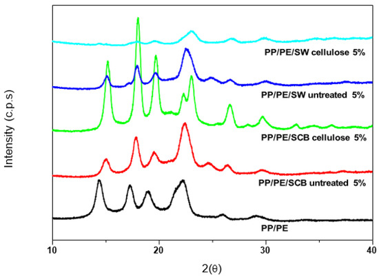 The XRD patterns of PP/PE, PP/PE/SCB, and PP/PE/SW blend composites are displayed in Figure 3, and Table 3 summarizes the crystallinity index and size. The PP/PE blend patterns consist of crystalline peaks at 14.38° (110), 17.29° (040), 18.96° (130), and 22.24° (041), which are typical crystal lattices of α PP [29]. Furthermore, there are also peaks at 21.6 (110) and 23.4 (200), which correspond to orthorhombic PE lattices, and halo bump peaks at 26.01° and 29.09° [8,22]. The introduction of both untreated fibers and cellulose generally reduced the intensities of crystalline peaks, except for PP/PE/SCB with 5% cellulose. This is normally attributed to swelling of the amorphous domain due to the defects created by the fiber [16,17]. It is also evident that the introduction of cellulosic fiber did not change the crystalline structure of the PP/PE blend. However, in the case of PP/PE/SCB cellulose 5%, it seems that whatever cellulose derivative formed has favored more of the crystal lattices of PP. These observations are verified by the crystalline sizes, which were shown to increase with disruption of crystalline lattices (Table 3). Moreover, the PP/PE/SW cellulose 5% and PP/PE/SCB cellulose 5% displayed the highest crystallite size and lowest crystallinity compared to their fiber counterparts. The reason might be due to an increase in PP/PE crystalline interplanar distance because of strong cellulose interaction, caused by a decrease in intermolecular hydrogen bonding, as discussed in the FTIR results.