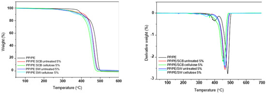 Figure 4 presents the TGA and DTG of PP/PE, PP/PE/SCB, and PP/PE/SW blend composites, and their respective degradation temperatures are summarized in Table 4. The PP/PE blend showed two-stage decomposition which is related to the degradation of neat PP and PE, respectively, in the blend [15]. Furthermore, the PP/PE/SCB and PP/PE/SW blend composites displayed two degradation steps. In this case, the first step shifted to lower temperatures compared to the pristine blend. It is known that low thermal stability of fiber/cellulose has the potential to lower the degradation temperatures of polymer composites [2,13]. However, in this study, the fiber seems to have an intermediary degradation temperature with the PP. The thermal decomposition results in Table 4 indicate that all the blend composites are thermally less stable compared to the neat PP/PE blend. None, except poor interfacial interactions, can better explain the observation as seen from SEM images. In fact, cellulose containing blend composites appeared to be the least thermally stable compared to untreated ones. While cellulose derivatives and thermal degradation mechanisms are possible reasons [20], vacant space and poor distribution of fiber, as witnessed in SEM, and resulting crystallinity could also account for the observations. On the contrary, Dikobe et al. [15], in their study, observed an increase in thermal stability with the introduction of WP. They related the improved thermal stability to WP char decomposition, which acted as a barrier that delayed the heat transfer to the polymer matrices. In this study, this is not necessarily the case because the introduction of untreated filler and cellulose appeared to have accelerated the degradation of the PP/PE.