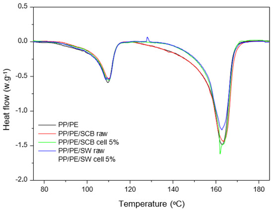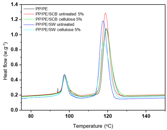 The DSC melting and crystallization curves are shown in Figure 5 and Figure 6, respectively. Table 5 summarizes the results obtained for melting temperature (Tm), crystallization temperature (Tc), heat of fusion (∆H), and crystallinity ratio (Xc). The PP/PE blend clearly displays two well-separated melting peaks for all composites, corresponding to the Tm of LDPE and PP components at low and high temperatures, respectively [17,19]. The DSC data summarized in Table 5 indicate that the introduction of untreated fiber and cellulose does not significantly change the melting and crystallization behavior of both PE and PP. Darweesh et al. [7] also reported minimal changes with variations in the blend compositions in their studies. The slight change to lower temperatures for the melting temperature of PP was correlated to a change in crystal structure. Similar observations were also reported by Khanam et al. [2] who investigated the recycled polymer-based date palm fiber reinforced composites. However, in our case, there is a delayed crystallization for blend composites. According to Dikobe et al. [23], a small variation in the crystallization temperature of the PE influences the fiber to locate in PE, which leads to the crystallization route of the blend composites. The rationale is highly possible in the current study; however, it seems as though the SCB cellulose was dispersed almost homogeneously on both phases since its crystallization appeared to be more stable than that of the blend composites containing SW cellulose. Perhaps it is for that reason that it has shown exceptional crystallinity in XRD. As expected, the melting enthalpy (∆Hm) of PP and PE decreased with the introduction of fiber and cellulose due to the decrease in polymer matrix quantity [25], signaling that lower crystallinity developed for the two components [8]. This decreasing trend of crystallinity was also reported in the XRD investigation. There is also a huge difference in the observed enthalpy (∆Hobs) values and calculated (∆Hcalc) values of PE as compared with PP. This might indicate that the crystallization behavior of PE is probably influenced by the presence of fiber and celluloses in the blend composites.
