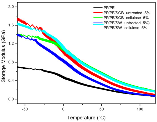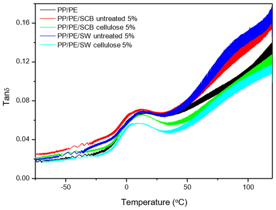 The tan δ values in Figure 8 increased with a temperature increase before and after the glass transition temperature of the blend. The untreated SCB and SW blend composites appear to have higher tan δ compared to cellulose counterparts, likely due to strong restriction of the mobility of their polymer chains [26]. Furthermore, both the untreated and cellulose introduction did not cause a significant shift in Tg of the blend, except for a small variation and broadening of the peak in blends incorporated with cellulose. The Tg shift in this case might be related to better interfacial interaction between the celluloses and PP/PE blend, as highlighted in the FTIR results. In addition, the broadening of the peak might be due to an increase in the segmental relaxation time of the polymer matrix caused by polymer–filler interaction [23].