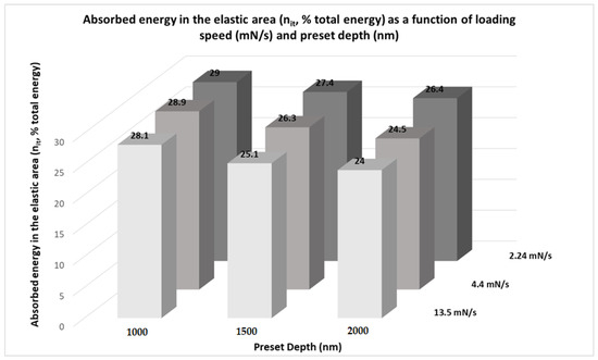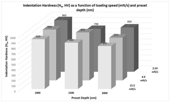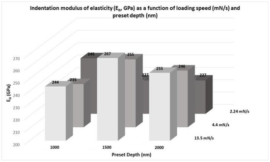 Graphical representations of Table 1 data are presented in Figure 1, Figure 2 and Figure 3. More specifically, Figure 1 shows the effect of the preset depth and the loading speed on the indentation hardness Hit, Figure 2 shows the corresponding effect on the indentation modulus of elasticity Eit, and Figure 3 presents the effects on the absorbed elastic energy nit.