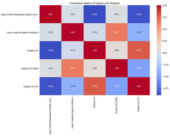 Based on the image analysis, the most significant correlations identified are as follows: The correlation between the input initial indentation depth (nm) and the output hardness value (Hit) is marked by a correlation coefficient of −0.90, indicating a strong negative correlation. This suggests that an increase in indentation depth leads to a significant decrease in the hardness value. Similarly, the initial indentation depth and the nit percentage show a strong negative correlation with a coefficient of −0.86, meaning that a deeper indentation correlates with a lower nIt percentage. Conversely, the input loading speed (mN/s) and the output modulus of elasticity (EIt, in GPa) have a positive correlation coefficient of 0.67, implying that higher loading speeds result in increased EIt values. There is also a strong positive correlation between the output hardness value (HV) and the nit percentage, with a correlation coefficient of 0.78, indicating that these outputs tend to increase or decrease in tandem. However, the correlation between output EIt (GPa) and output nIt (%) is moderately negative, with a coefficient of −0.50, suggesting that an increase in EIt is associated with a decrease in nit, or vice versa. The matrix also displays weaker correlations, as denoted by coefficients closer to zero, highlighting less significant linear relationships. While these correlations offer insights into the dataset’s linear relationships, it is crucial to remember that correlation does not equate to causation. Non-linear relationships might not be adequately represented by these coefficients. For a thorough understanding of the variables’ inter-relations, further analyses, including causation analysis and non-linear modeling, might be required. Despite the need for cautious interpretation of correlation analysis outcomes, these results confirm earlier speculations regarding the impact of indentation depth on hardness values and the effect of loading speed on the modulus of elasticity.