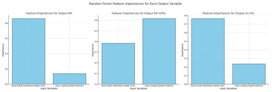Observations from Figure 5 reveal that for the output variable HV (hardness value), the “Input Initial Indentation Depth” emerges as a crucial predictor, boasting a very high importance score. This underscores its primary role in determining the hardness value. On the other hand, the “Input Loading Speed” holds a considerably lower importance score, suggesting its subordinate influence on the hardness value compared to indentation depth. Regarding the output variable Eit (elastic indentation), a similar pattern is observed. The “Input Initial Indentation Depth” stands out as the most influential feature, asserting its significance in the model’s predictions. Although the “Input Loading Speed” ranks lower in importance, it still plays a role in forecasting elastic indentation. For the output variable nit (strain rate sensitivity factor), the importance scores are more evenly distributed between the “Input Initial Indentation Depth” and the “Input Loading Speed”, with the former maintaining a slight lead. This indicates that both features are considered relevant by the model in predicting the strain rate sensitivity factor, with indentation depth being a tad more predictive. Conclusively, the “Input Initial Indentation Depth” is identified as the consistently dominant feature across all output variables, suggesting that variations in indentation depth are likely to exert a more significant impact on the modeled material properties than changes in loading speed. Nevertheless, the contribution of the “Input Loading Speed” to the prediction process, while lesser, is still deemed valuable.