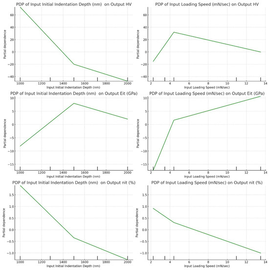Summarizing the insights from PDPs, indentation depth significantly affects all three output parameters, highlighting that deeper indentations generally result in decreased hardness and elastic modulus, while nit (%) tends to increase. Loading speed also significantly impacts the outputs, with both hardness and elastic modulus increasing with higher loading speeds, although its effect on nit (%) is less pronounced but slightly positive.